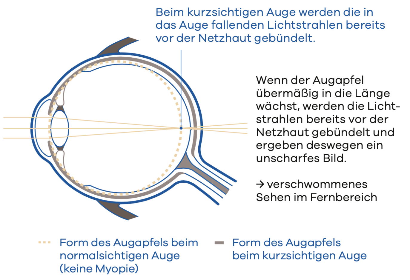 Die Kurzsichtigkeit, in der Fachsprache „Myopie“, ist ein ein Sehfehler, bei der man in der Ferne nicht deutlich sieht, z.B. die Wandtafel in der Schule aus den hinteren Reihen. Myopie ist eine sehr häufige Fehlsichtigkeit, die in der Regel bei Kindern im Schulalter beginnt und weiter fortschreiten kann bis das Auge nicht mehr wächst. Aber auch im Erwachsenenalter kann sich die Kurzsichtigkeit weiter entwickeln.